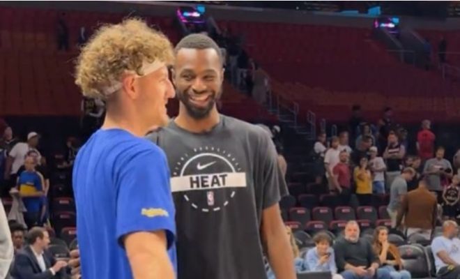 波杰姆斯基賽前找到前勇士隊(duì)友維金斯,兩人擁抱熱聊。